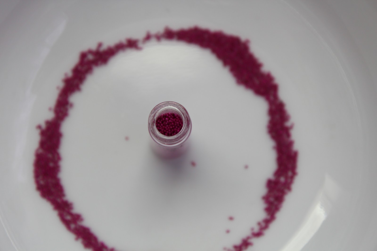 Above the bowl, sprinkle the nail caviar on your nail before the clear polish has dried.